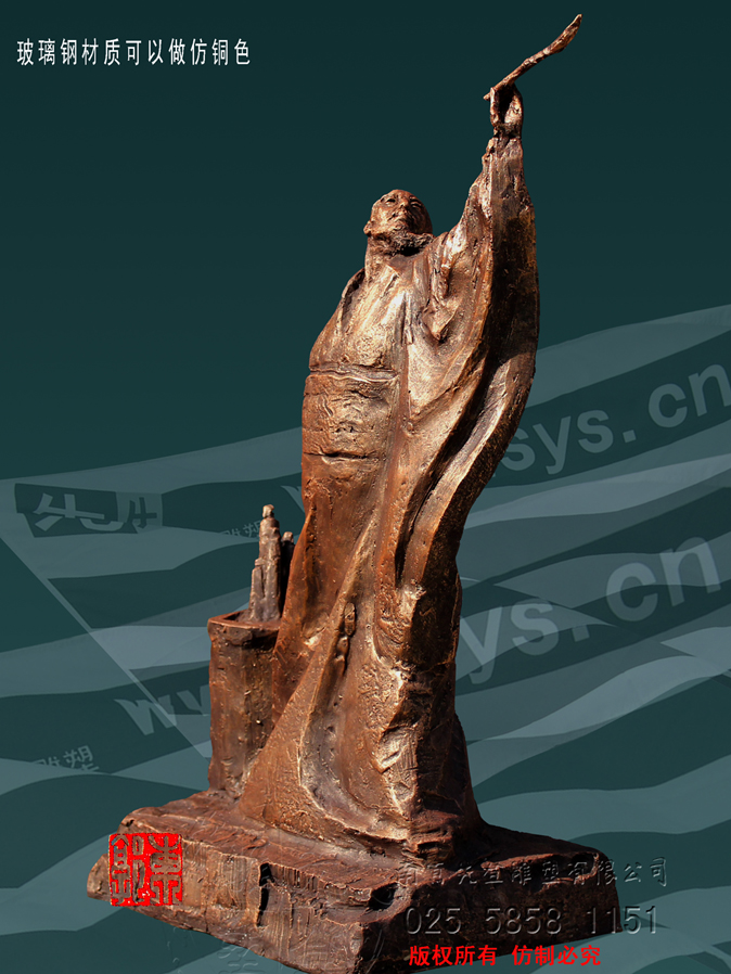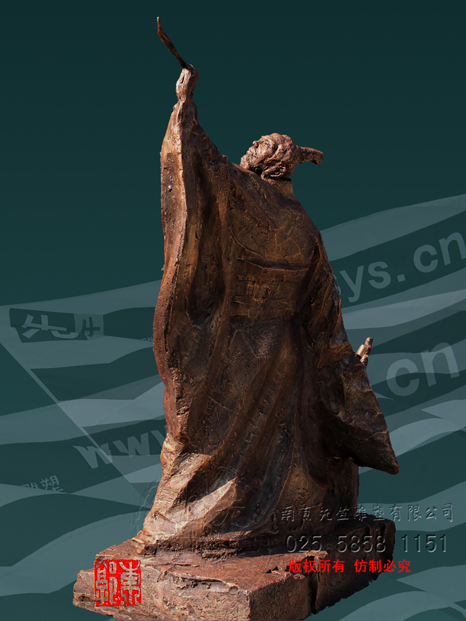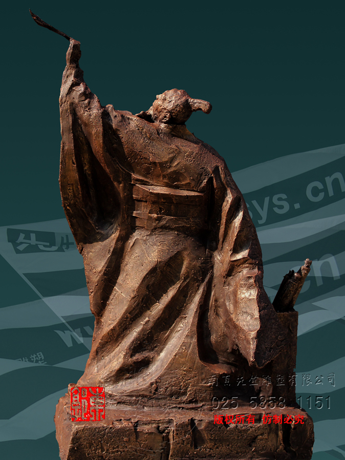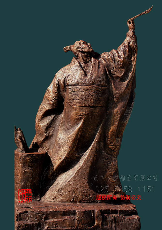 張芝字伯英,出生官宦之家,幼時高操,勤習學書,朝廷賞識,令他做官,而他并非貪圖高官厚祿,甘做布衣。素日臨池學書,得崔杜之法,復而變之,遂成“今草”。張芝對書藝癡醉令人驚嘆。衛(wèi)恒《四體書勢》里有言“凡家之衣帛,必先書而后練之。臨池學書,池水盡墨。”張芝對于書法藝術的不斷索求,終成一代“草圣”,當是“為世所寶,寸紙不遺”。雕塑里張芝如平日習作,但見他揚手,握管,在虛空中縱姿揮毫,一如其書法,一筆而就,不拖沓凝滯,衣袍素袖宛如字之體勢婉轉(zhuǎn)流暢,舒箋觀鳥跡,研墨染魚緇。