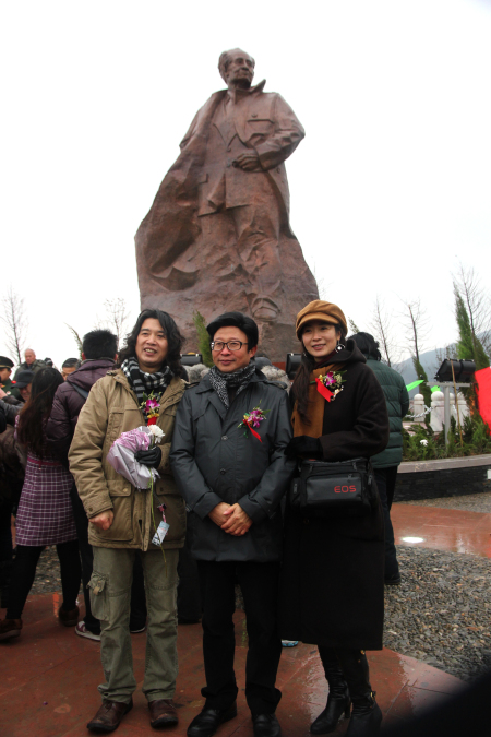 原大陳鎮黨委孫書記和雕塑家東郭教授(左)及其夫人張莉(右)在胡耀邦雕像前合影